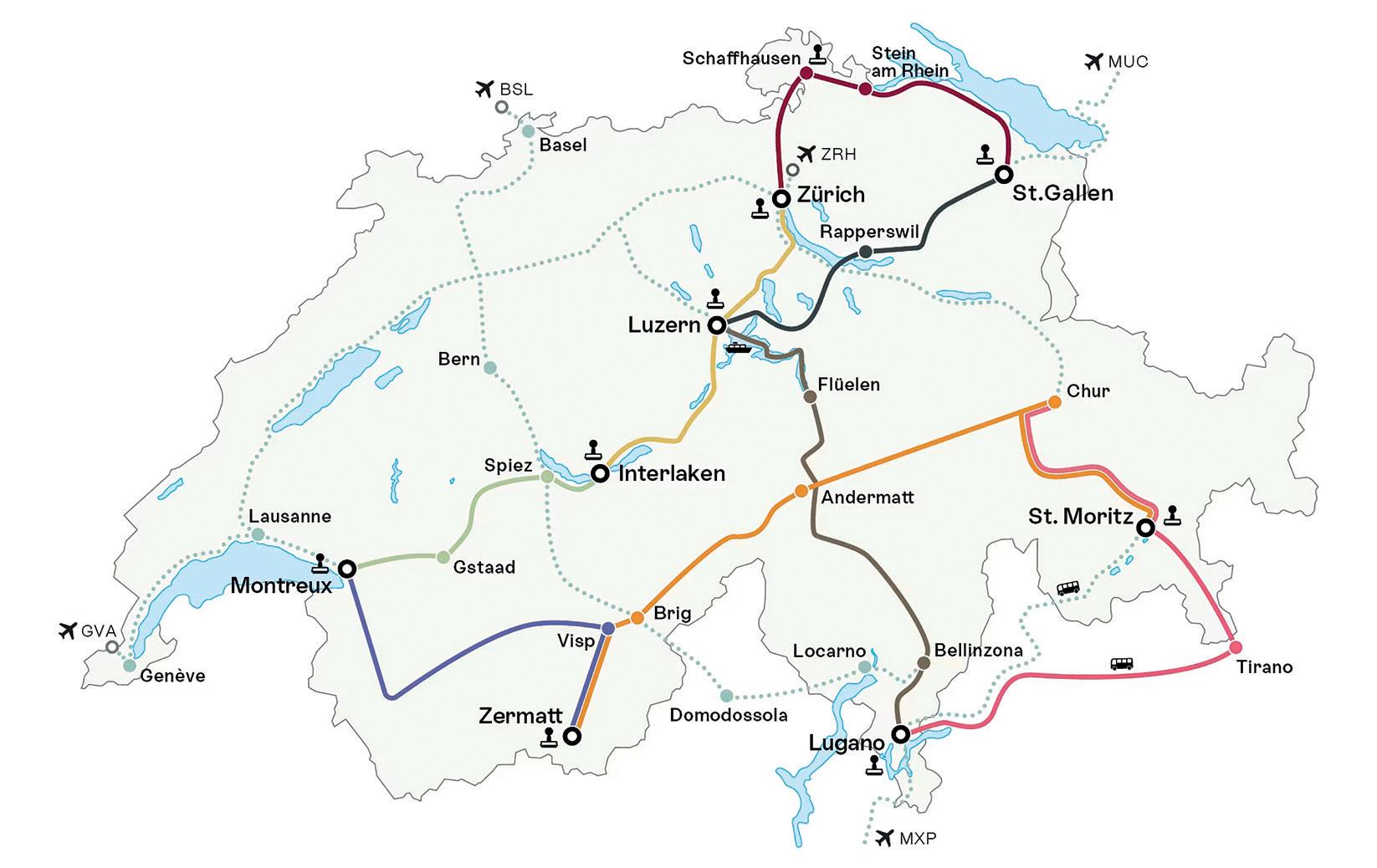 Depart UK; Zurich (1nt); Interlaken (1nt); Montreux (1nt); Zermatt (1nt); St. Moritz (1nt); Lugano (1nt); Lucerne (1nt); Arrive UK