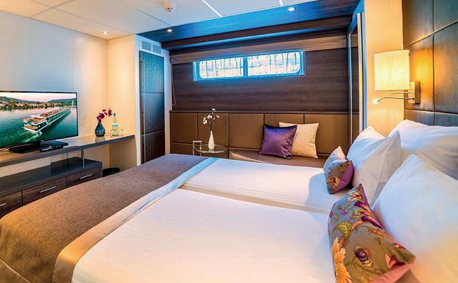 The Amadeus fleet features some of the largest cabins available on European waterways. All cabins include a modern en-suite bathroom with shower and w/c, a walk-in wardrobe, choice of bed configuration (double or twin bed), flat-screen television, mini bar, individual climate control, hair dryer, direct dial telephone and in-room safe.
