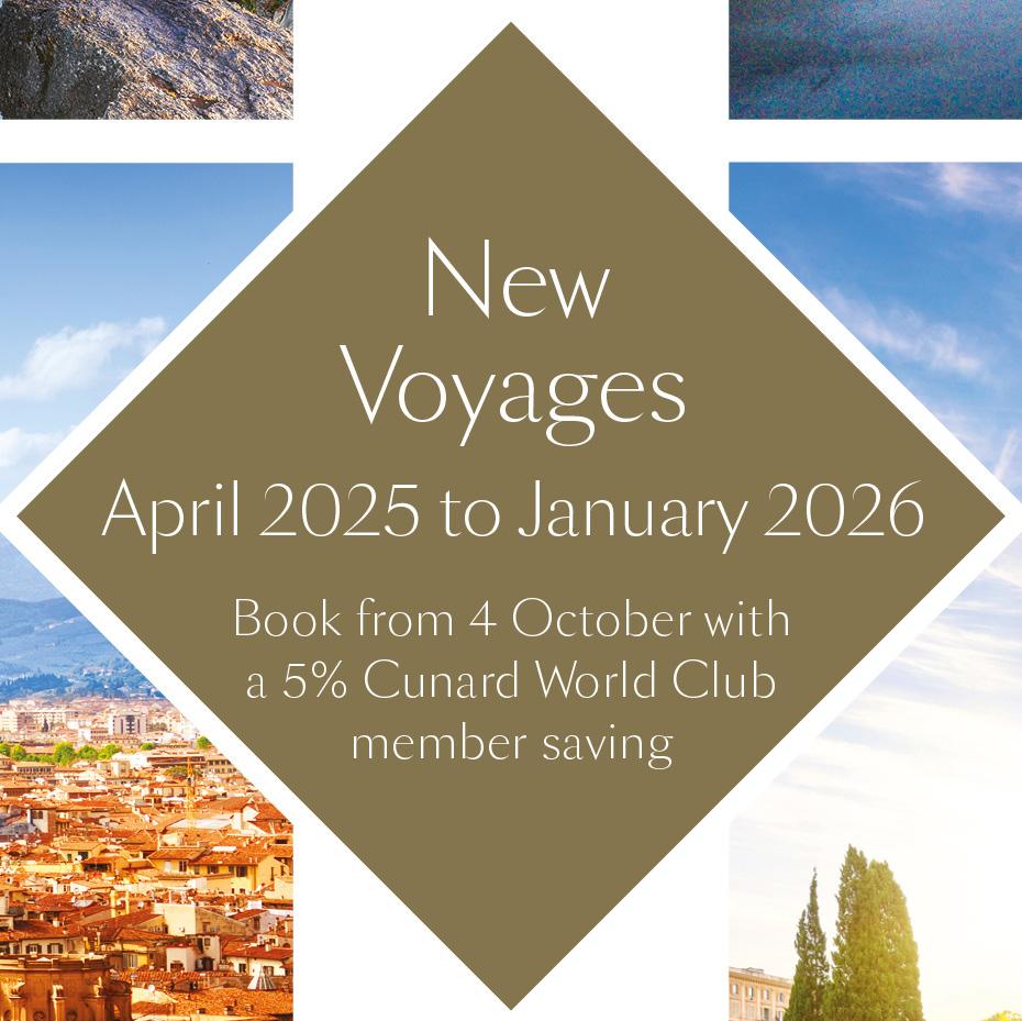 Full operator terms & conditions apply. Cunard World Club members can enjoy a 5% early booking discount on Cunard Fare or Early Saver Fare when booking between 4 October and 4 December 2023. The offer is valid for new voyages scheduled between April 21, 2025, and January 6, 2026 (except Queen Elizabeth's Summer 2025 program). The discount applies to the cruise-only fare and is subject to availability. Complimentary Cunard Fare benefits vary by voyage type for bookings of 7 nights or more, not combinable with Early Saver Fares. Complimentary money to spend on board applies to the first two guests sharing a stateroom and is non-refundable and non-transferable. Offers subject to availability change. Cunard reserve the right to withdraw this offer in whole or on individual voyages at any time. E&OE.