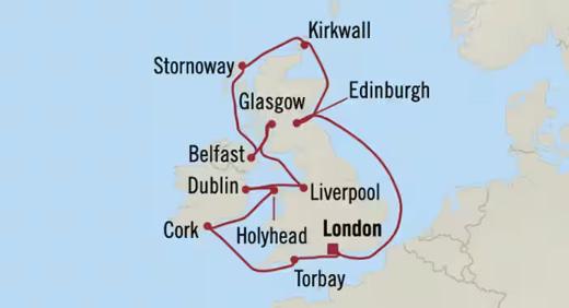 Southampton (UK), Newcastle (UK), Edinburgh (Scotland), Invergordan (Scotland), Kirkwall (Orkney Islands), Stornoway (Scotland), Dublin (Ireland), Belfast (Northen Ireland), Douglas (Isle of Man), Cork (Ireland), Portland (UK), Southampton (UK)