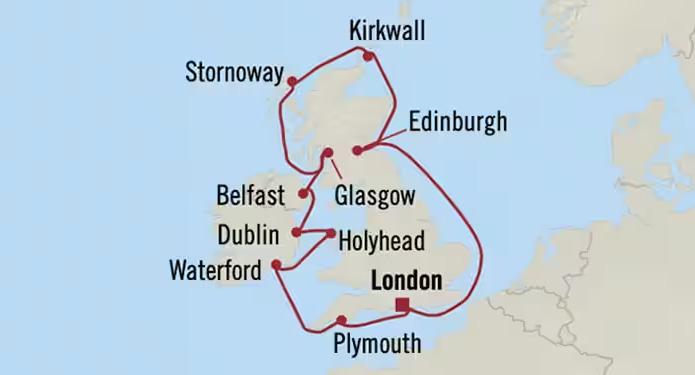 Southampton (UK), Newcastle (UK), Edinburgh (Scotland), Invergordan (Scotland), Kirkwall (Orkney Islands), Stornoway (Scotland), Dublin (Ireland), Belfast (Northen Ireland), Douglas (Isle of Man), Cork (Ireland), Portland (UK), Southampton (UK)