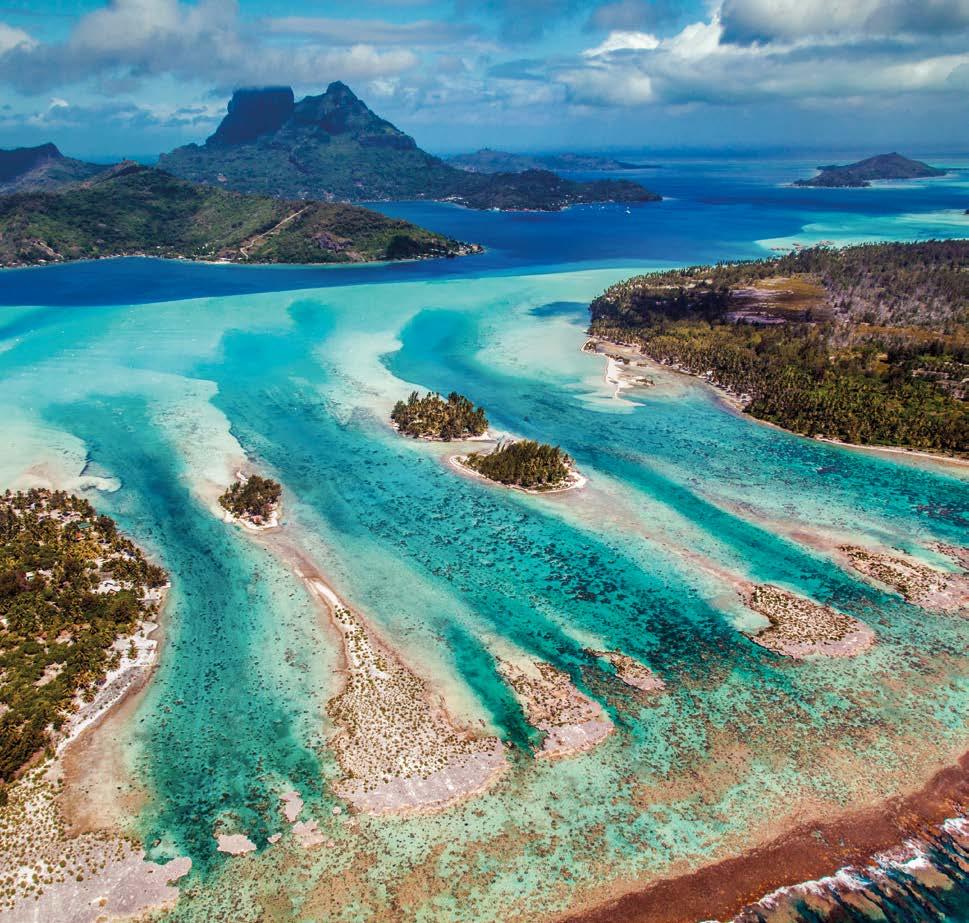 An extinct volcano surrounded by a lagoon and coral reef, this island’s name in ancient Tahitian — Pora pora mai te pora — meant “created by the gods”. They must have loved art, as the bays of Bora Bora are painted in a kaleidoscope of colours: dark indigo for deeper waters, blue and green pastels closer to shore, and coral reefs in thousands of reds, blues and purples.