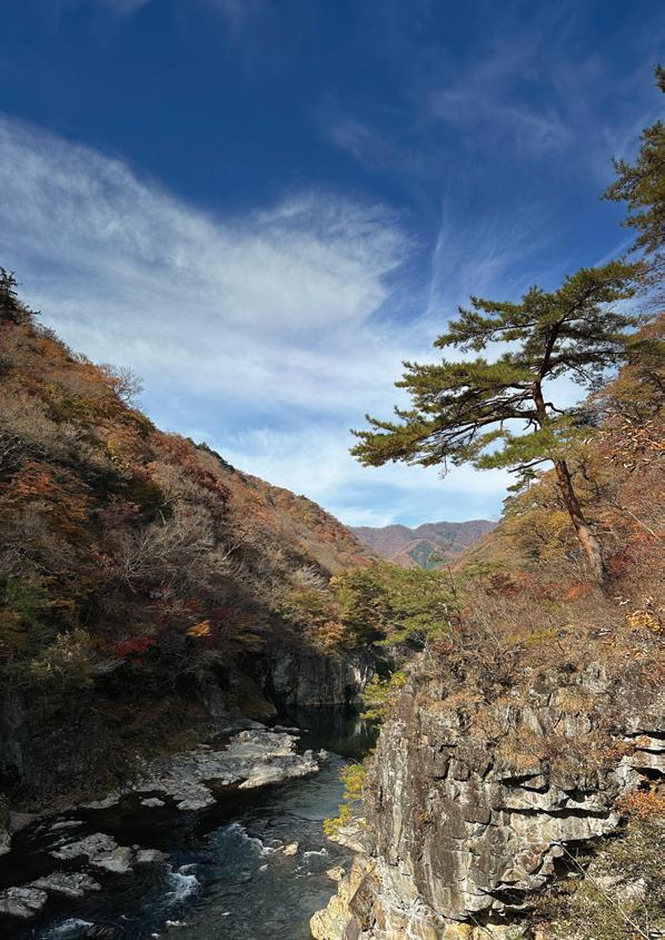Main image: Ryuokyo Gorge, Nikko in late autumn; Right: Lindera obtusiloba in full autumn colour
