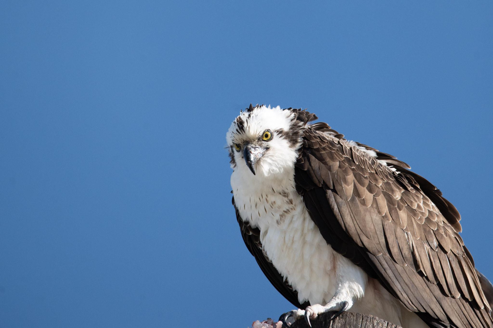 This osprey catches sight of the camera while sat atop a telephone pole.