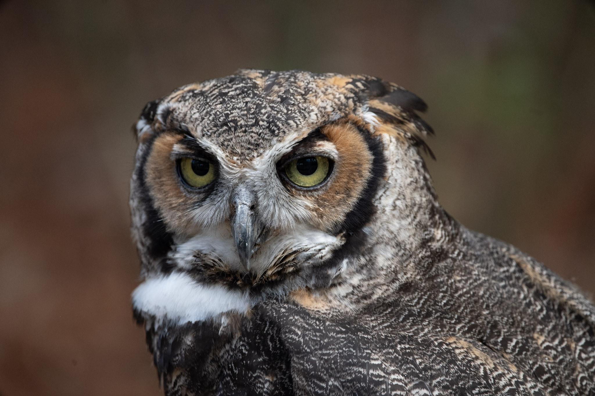WISE EYES: A Great Horned Owl on a low branch looking off into the distance.