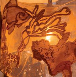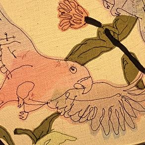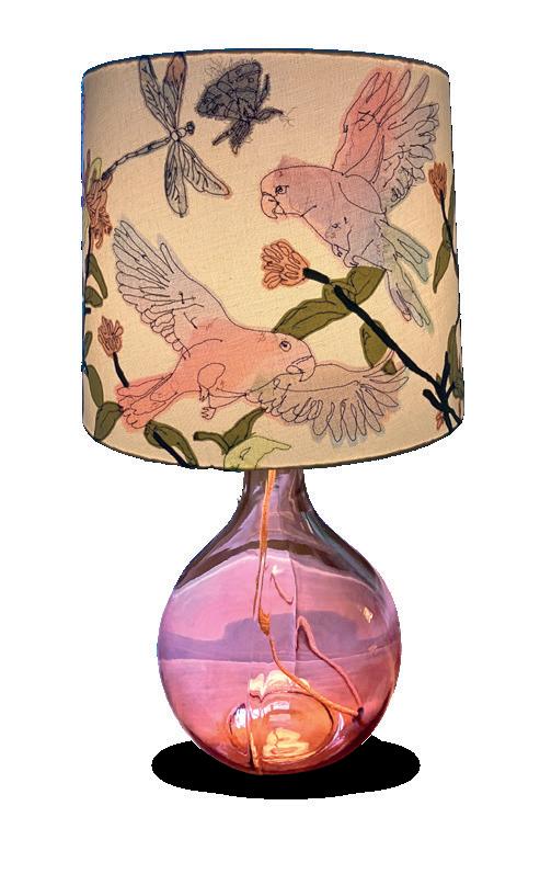 Working from original sketches, using collected and plant-dyed fabrics, Sally uses machine embroidery and appliqué to create whimsical lampshades, bowls, and 2D pieces.