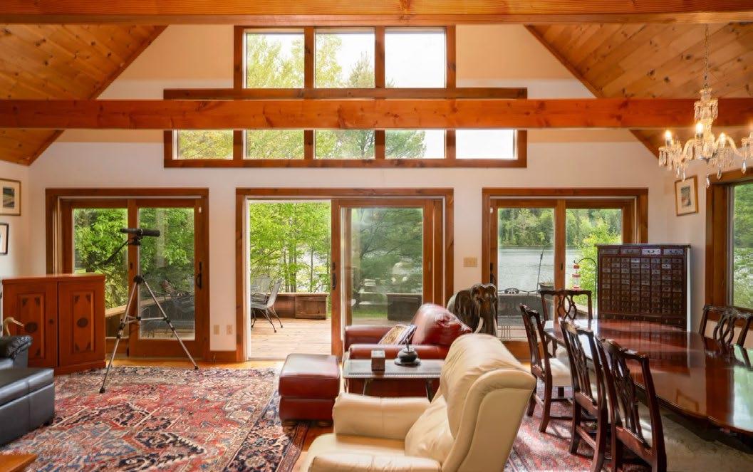 Escape to Ondine, a tranquil Vermont estate on the edge of Green River Reservoir State Park, offering unparalleled seclusion on over 15 acres with 1,000 feet of waterfont, just North of Stowe. This unique multi-building retreat features four meticulously crafted residences, individually or combined may offer short or long term rentals, as VRBO or Airbnb, with the potential for substantial rental income. Each boasts tongue and groove pine interiors with panoramic views of the pristine lake and mountains beyond. The octagon-shaped main house impresses with a soaring 28-foot copula, a grand great room, and custom cherry cabinetry that complements the top-tier Wolf and Sub-Zero appliances. Each guest residence echoes the grandeur of the main home, offering privacy and luxury for friends and family.