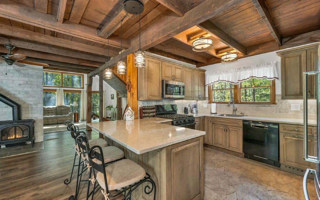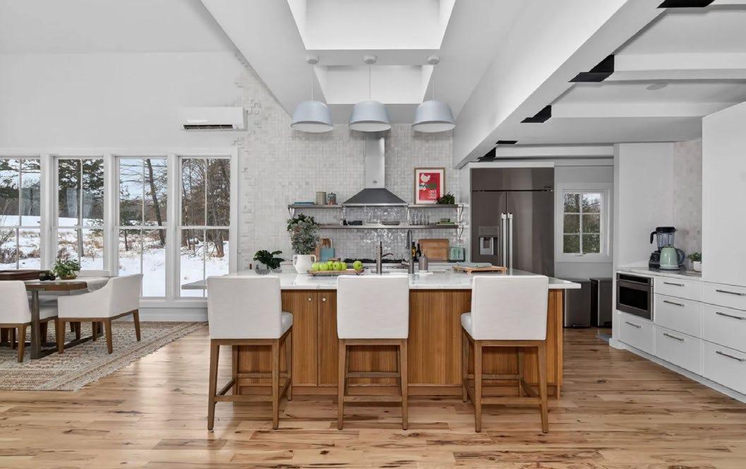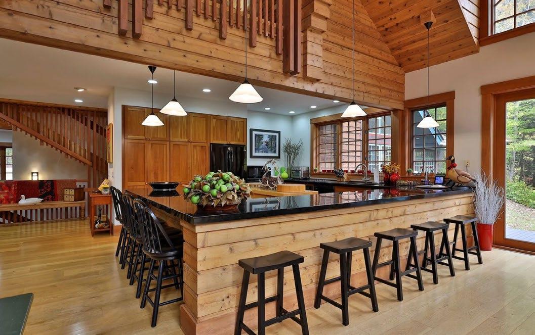 In homes throughout the Northeast’s ski country, architecture leans toward openness and light. Vaulted ceilings lined with warm