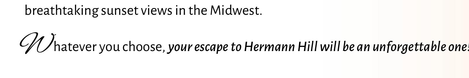 Winding through some of the prettiest scenery in Missouri, the Hermann Wine Trail hugs the Missouri River for 30 miles between Hermann and New Haven. HermannWineTrail.com Purchase Wine Trail tickets online or by phone, 573-486-2313 (Advance purchase required) Other inquires call 573-294-2228 Reserve Cellars