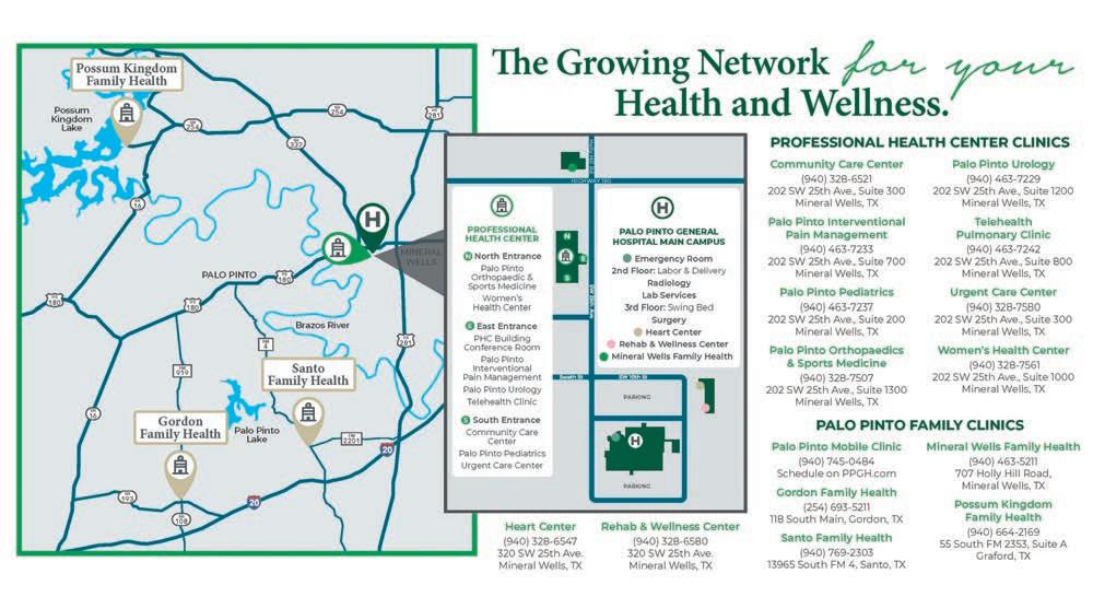 (940)463-7092 101HollyHillRoad, MineralWells,TX PossumKingdom FAMILY HEALTH FAMILYHEALTH Urgent Care UrgentCare 400SW25thAvenue•MineralWells,Texas76067•940-325-7891•ppgh.com Diagnosticassessments Women'sservices Men'shealth Tetanusboosters Minorillnessesandtreatment PrimaryCareProvider Sickvisits,noappointmentneeded Fastcareatalowercost OnsiteX-raysandlabavailable PaloPinto GeneralHospital WinterHours: Monday-Friday8:00am-4:30pm MemorialDay-LaborDay Tuesday-Friday8:00am-4:30pm Saturday9:00am-3:00pm Hours: Monday-Friday8:00am-5:30pm 940-664-2169 55SouthFM2353,SuiteA Graford,TX76449 940-328-6521 202SW25thAvenue,Suite300 MineralWells,TX76067 24954