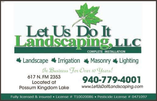 420 N. Main St. • Jacksboro, TX 76458 940-567-8950 6:30am–3pm Sun–Thurs • 6:30am–9pm Fri & Sat Lunch Buffet: 11 a.m. to 2 p.m. Daily Breakfast Served: 6:30 to 10:30 a.m. Daily Hop on down to The Green Frog! 25158 25191 Expert Masons. Full Supply Yard. Equipment Services. WHAT CAN WE BUILD FOR YOU? CUSTOM STONE WORK & ROCKYARD 300 N FM 2353, GRAFORD, TX // 940-779-3700 // customstoneworkpk.com PROUDLY SERVING OUR COMMUNITY FOR OVER 25 YEARS 25061 LAKE COUNTRY VACATION GUIDE • 31 • 2023-2024