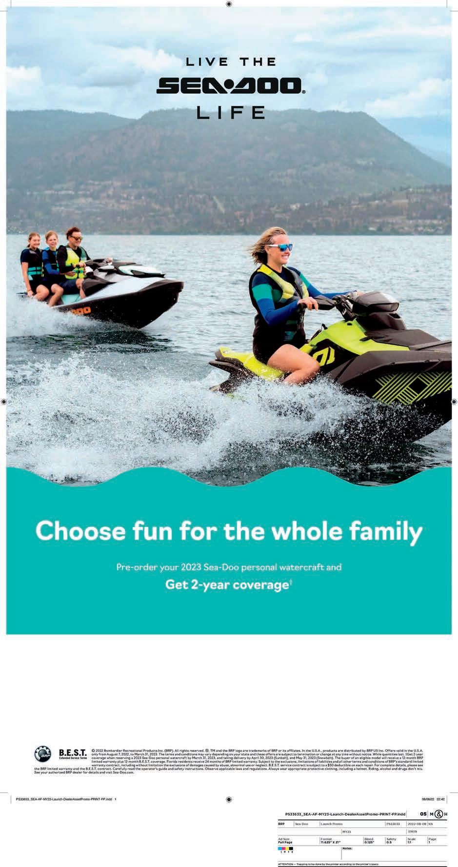 Your local Sea-Doo dealership right here at In Sportsman’s World on Possum Kingdom Lake Choose fun for the whole family , and the BRP logo are trademarks of BRP or its a iates. In the U.S.A., products are distrbuted by BRP US Inc. O ers valid in the U.S.A. only termination or change at any time without notice. While quantities last. †Get 2-year and May 31, 2023 (Snowbelt). The buyer of an eligible model will receive a 12-month BRP sions, limitations of liabilities and all other terms and conditions of BRP’s standard limited warranty contract, including a $50 deductible on each repair. For complete details, please see the BRP limited warranty and the B.E.S.T. contract. rotective clothing, including a helmet. Riding, alcohol and drugs don’t mix. See your authorized BRP dealer for details and 25075 LAKE COUNTRY VACATION GUIDE • 15 • 2023-2024