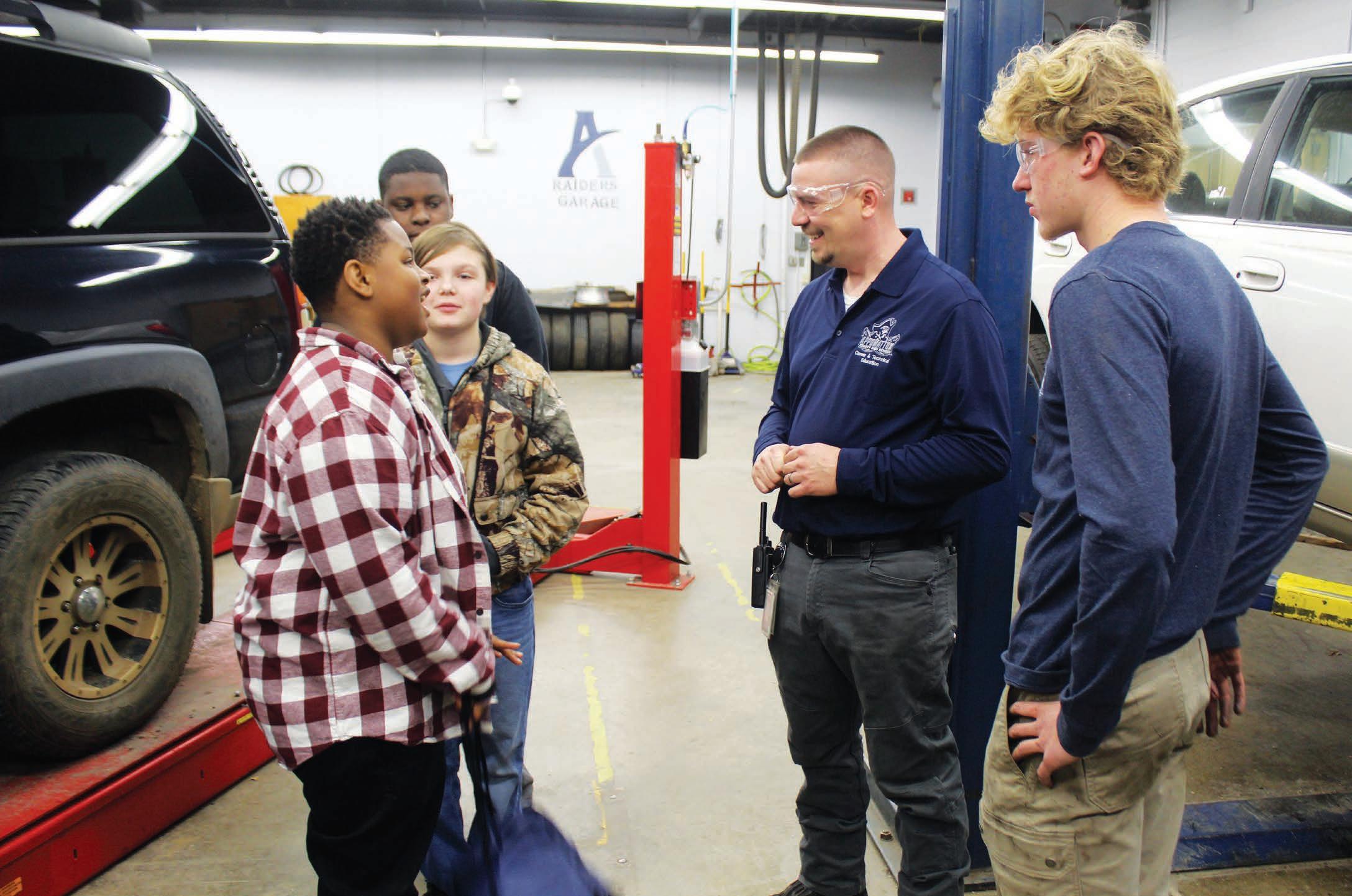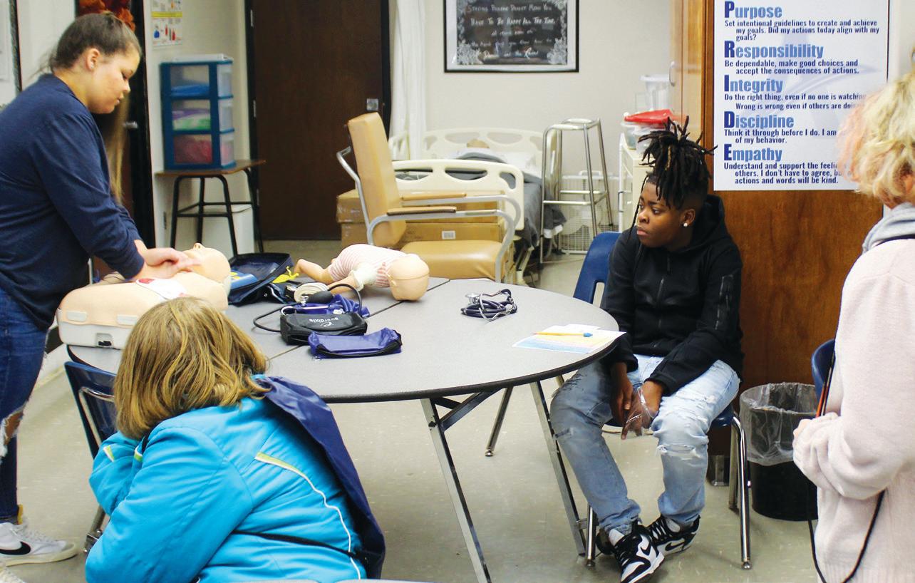 Shown on opposite page, Automotive Technology Instructor Jonathan Garrett (second from right) interacts with visiting Appomattox Middle School students during Raider Ready Day at Appomattox County High School. Pictured at left, Appomattox County High School student Makenzie Lecco demonstrates CPR to visiting Appomattox Middle School students in teacher Renee Wingfield’s nursing class during Raider Ready Day.