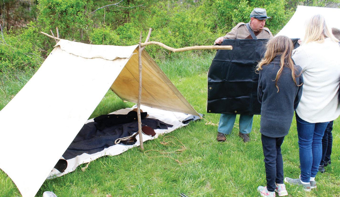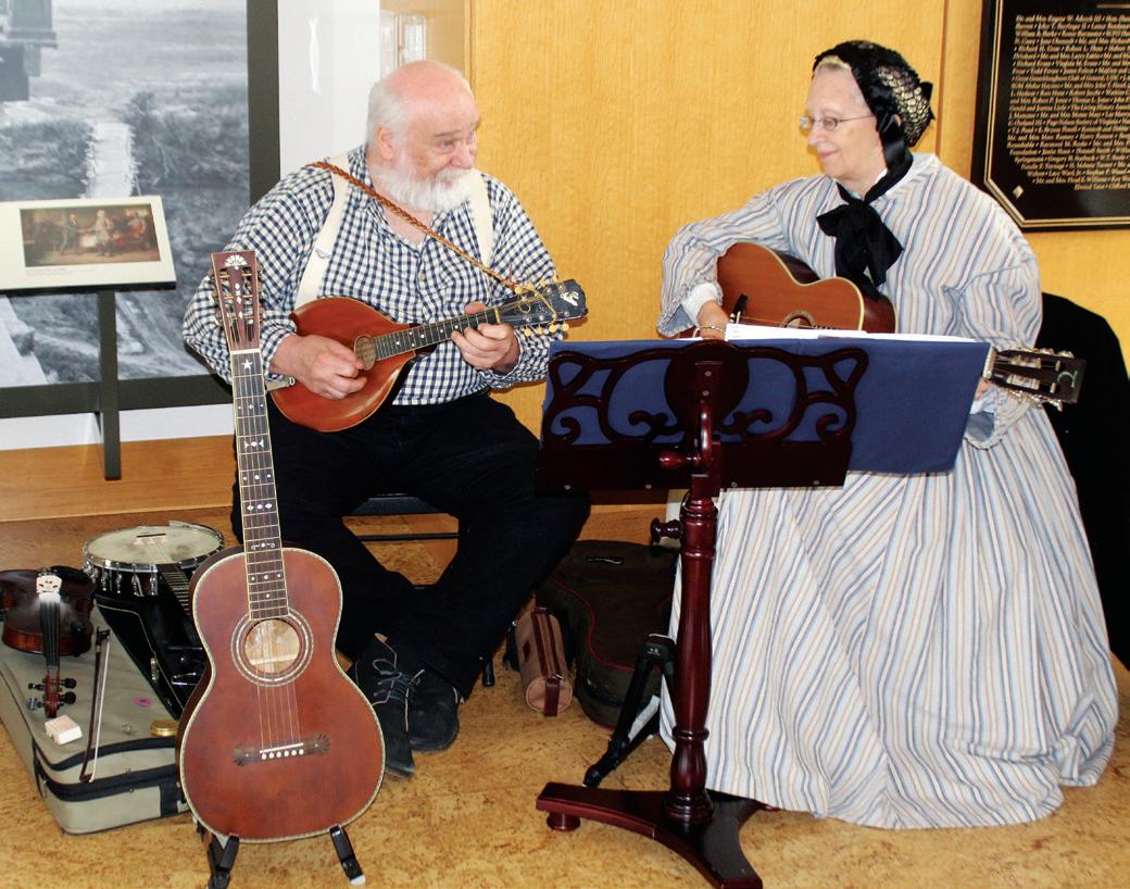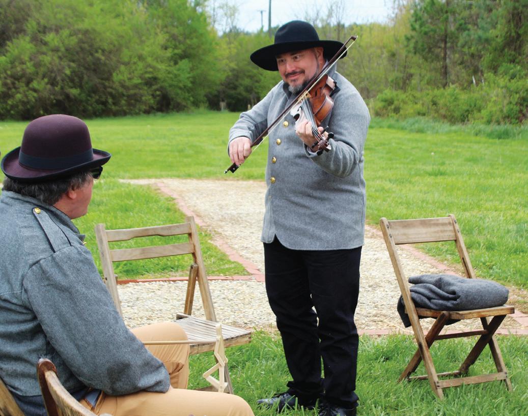 Shown at the left, a Civil War reenactor shows visitors a small makeshift supply tent, the type used by Civil War soldiers. Below at the right Doug Marshall (left), of Fredricksburg, and Tina Buchanan, of Spotsylvania, play 19th Century music. The instruments they played included a guitar, mandolin, banjo and fiddle. Below on the right, A Civil War reenactor plays a 19th Century tune on a violin. Photos by Charles Conrad.