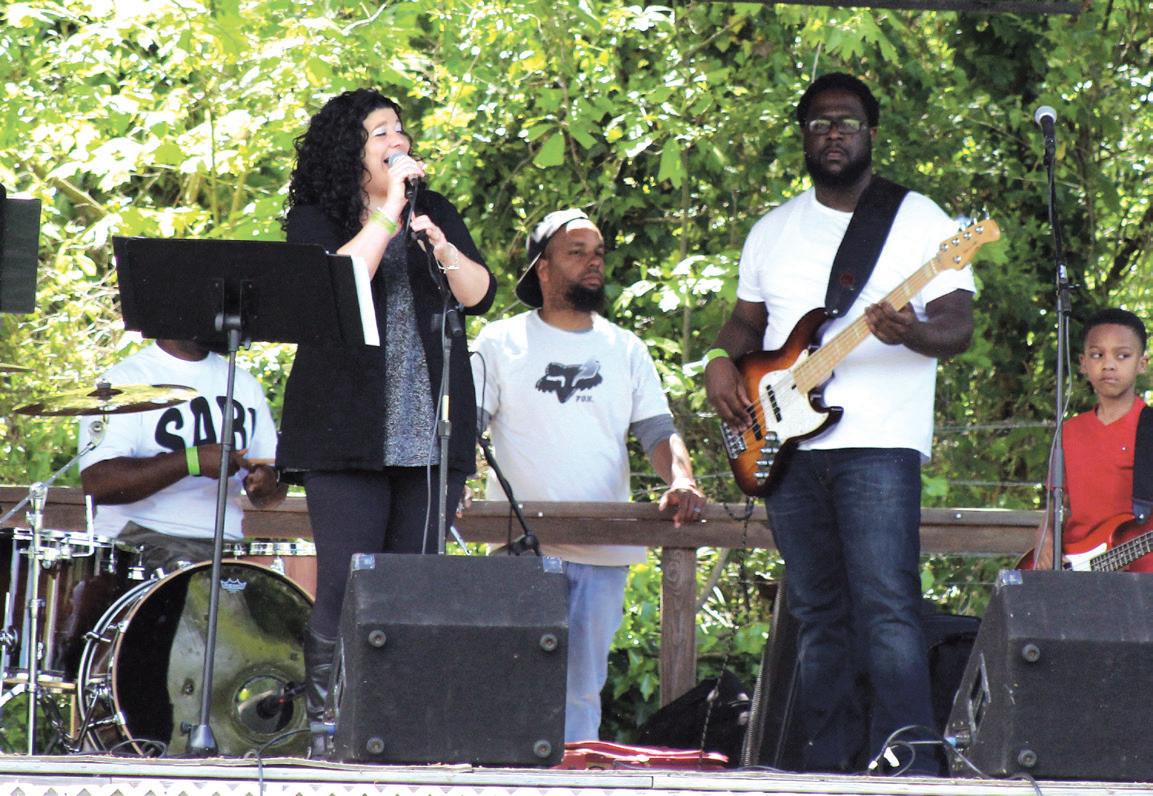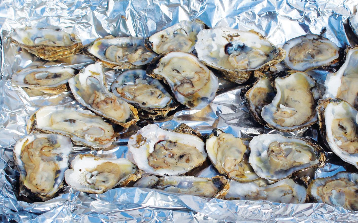 Pictured at the left, is a pan of cooked oysters at food vendor Gregory’s Grill during the Appomattox Oyster Fest. Shown below at the left is jazz, funk and R&B band Apple Butter Soul performs on stage at the Appomattox Oyster Fest. Below on the right, a female helper at Gregory’s Grill waves to the camera during the Appomattox Oyster Fest. Photos by Charles Conrad.