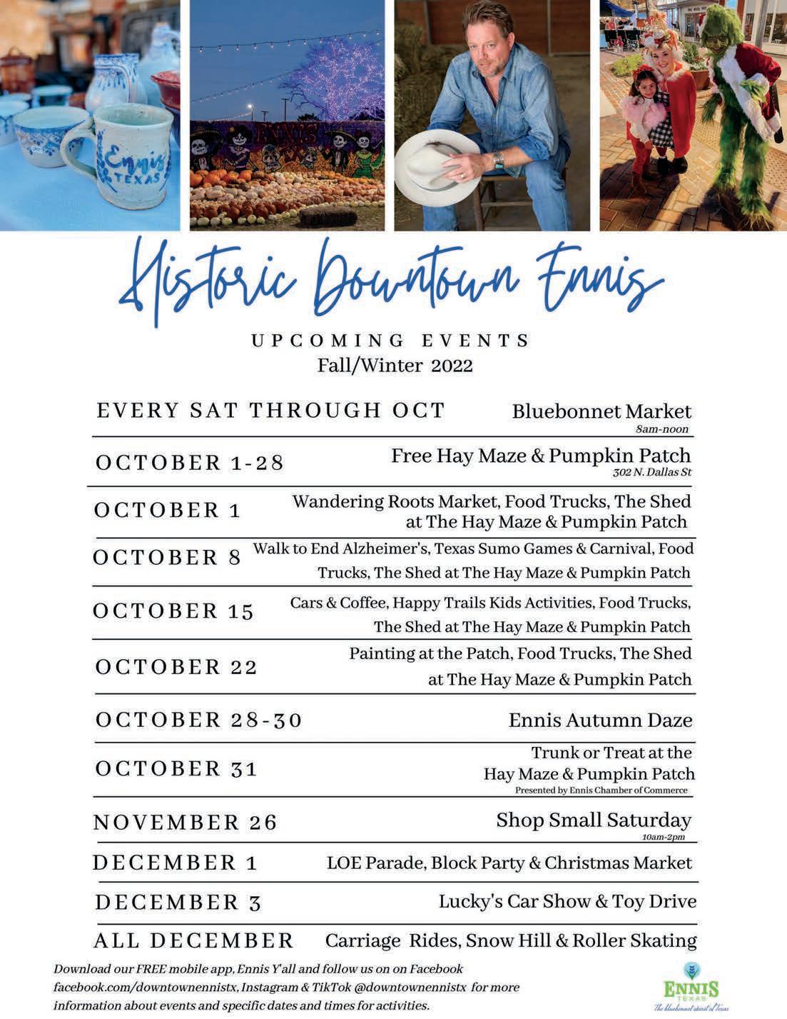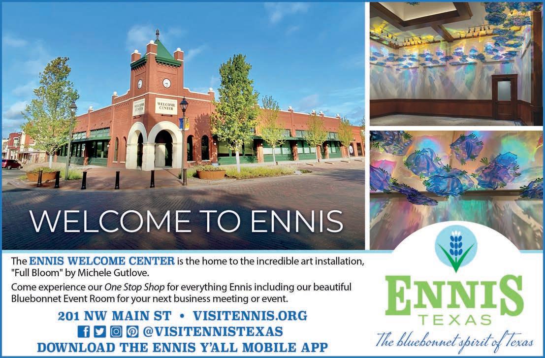 Visit www.visitennis.org, follow Downtown Ennis Tx on Facebook and Instagram or download the free mobile app Ennis Y’all for all updates. updates.