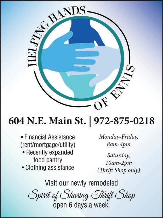Center serves the Ennis and Ennis SD area and is a great resource to citizens needing help with running errands for the homebound, picking up a prescription, financial assis tance with a bill, welfare checks, prayer or ust someone to talk to.