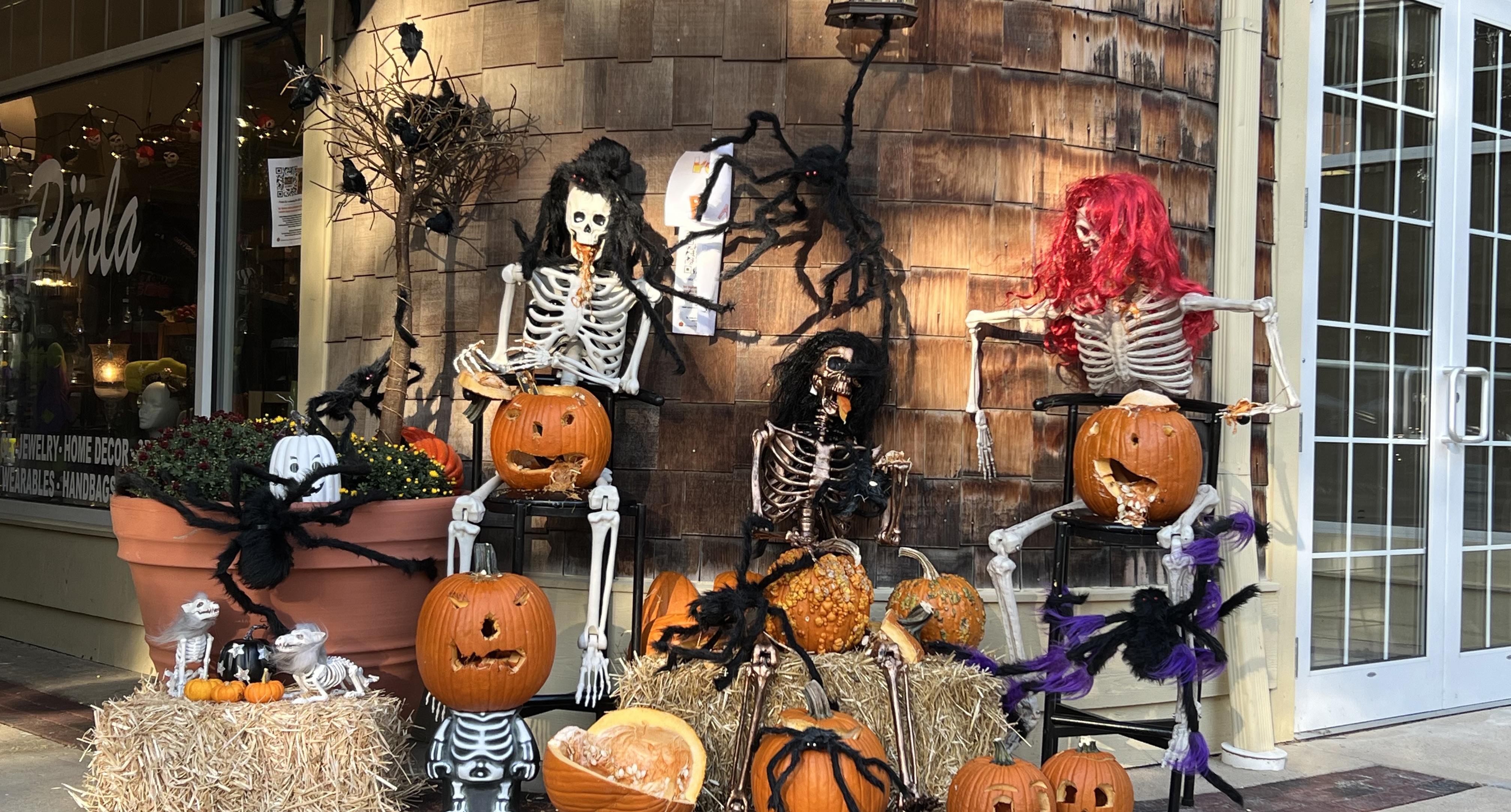 “Skeletons and pumpkins take center stage at Geneva’s Scarecrow Walk: a playful nod to Halloween’s spooky spirit and seasonal fun.”