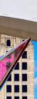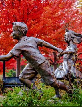 Image 1: Joy in Motion Bronze statues of children at play Image 2: Light and Geometry , a kaleidoscope of color reflects through Elgin’s downtown sculpture.