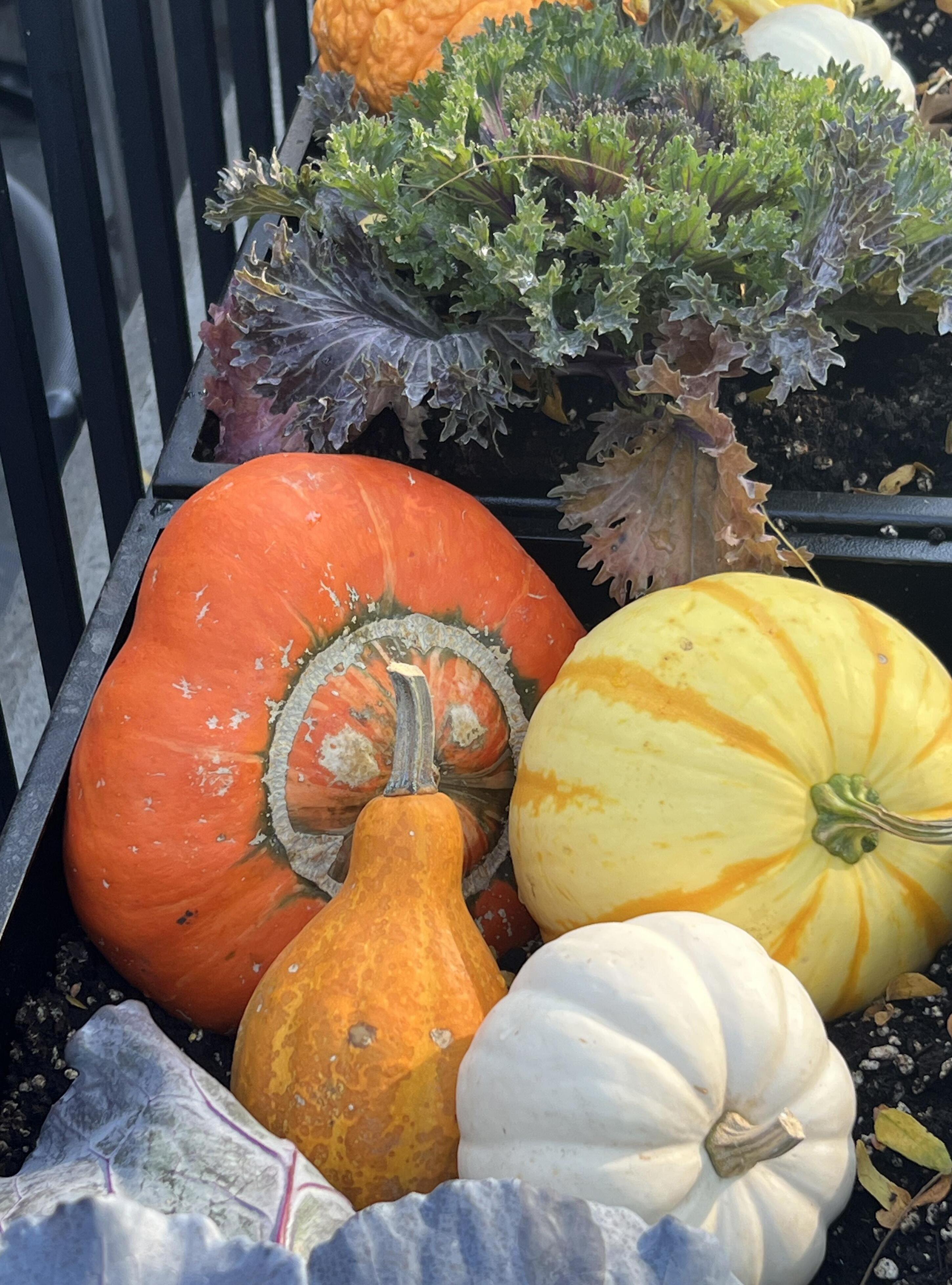“A vibrant still life of autumn at Geneva’s Scarecrow Walk: gourds, pumpkins, and kale bursting with the season’s rustic charm.”