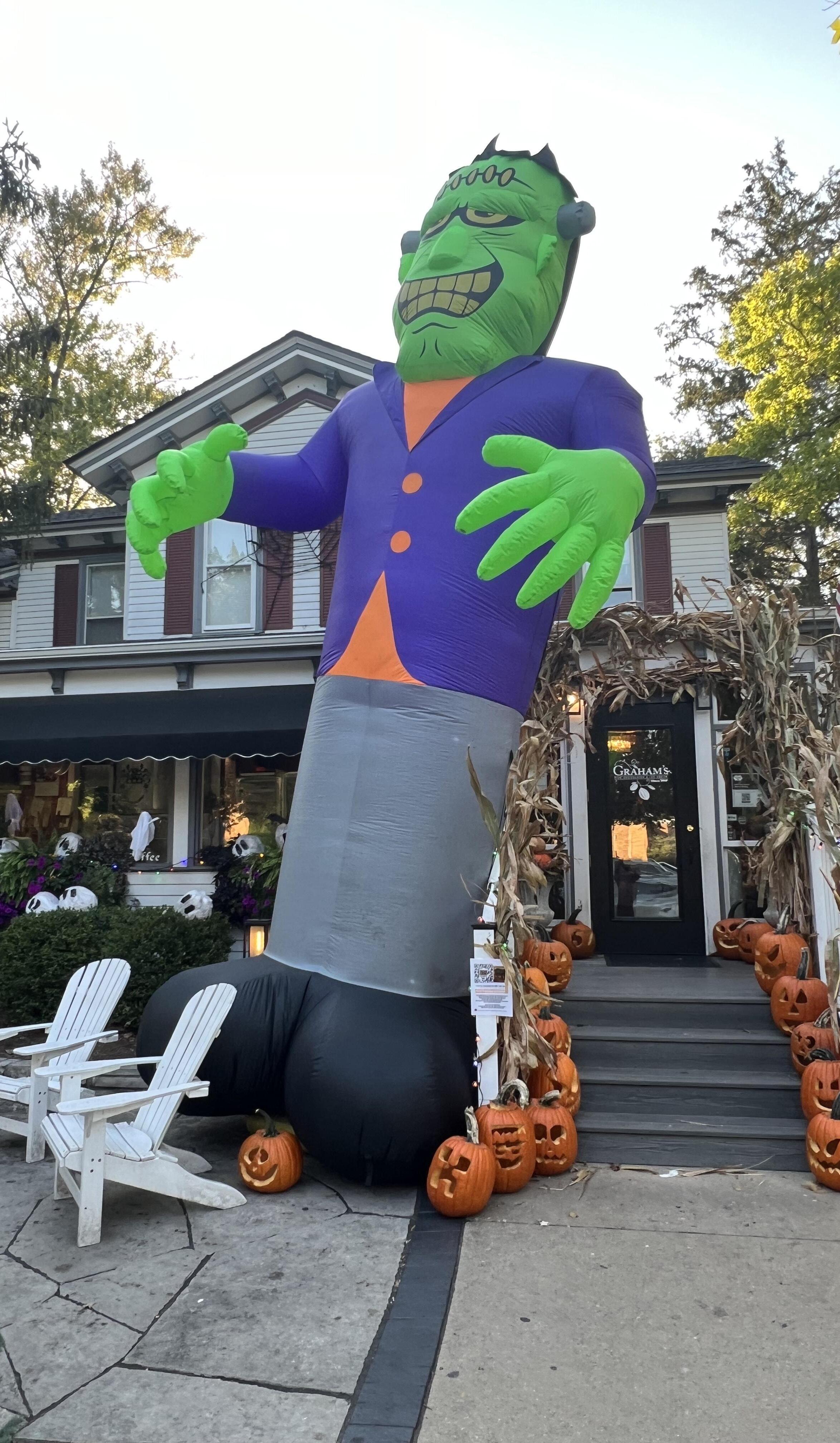 “A towering Frankenstein welcomes visitors to Geneva’s Scarecrow Walk where Halloween spirit looms large.”