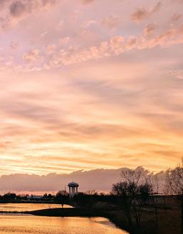“Sunset at Rotary Park in DeKalb, captured by Kim Wheaton, where fading light lingers like a benediction, mirroring still waters and quiet gratitude.”