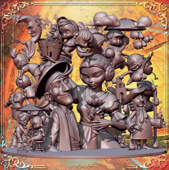 Així, els personatges del relat seran els distints estereotips de tipus de faller caracteritzats com a criatures fantàstiques, des de senzills follets fins a dracs i fades.