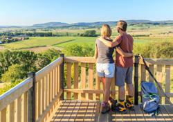 Wandern und Weingenuss gepaart mit traumhaft schönen Aussichten – das ist das »Weinpanorama Steigerwald« an den son nenverwöhnten Westhängen des nördlichen Steigerwaldes, genauer gesagt: zwischen Zabelstein und Stollburg. Hier finden Sie »Frankens Vielfalt im Kleinen« in einer ursprünglichen Landschaft, abwechslungsreich und bodenständig. Die Wanderwege in der Region lassen Wanderherzen höherschlagen. Der prämierte »Steigerwald Panoramaweg« führt von Nord nach Süd durch das Gebiet. Dazu bildet der »WeinSteiger« attraktive Schleifen und garantiert traumhafte Ausblicke.