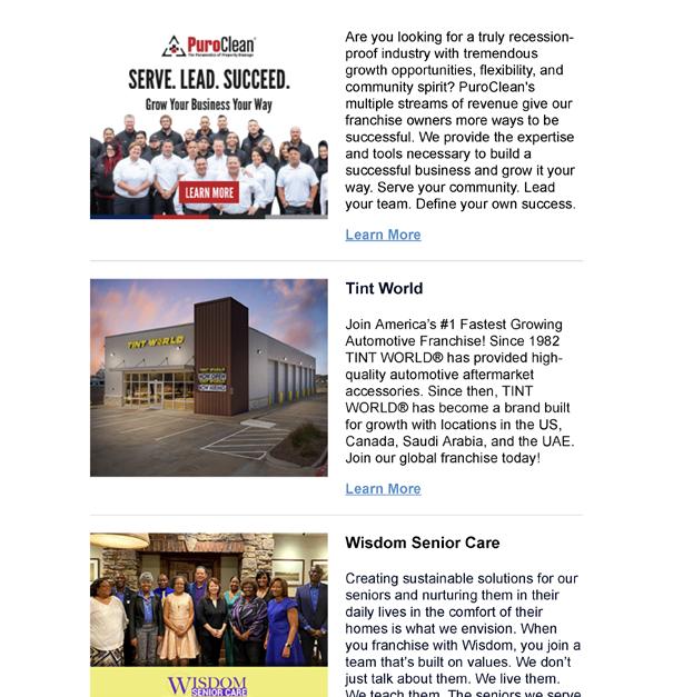 Our “ Franchise Opportunities for You ” is a combined e-blast that includes a maximum of six advertisers per email. Perfect for ongoing campaigns and starter opportunities, this affordable e-blast gets in front of 33,000+ prospective (and active!) franchisees.