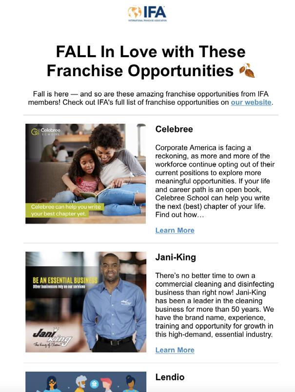 Sent on your behalf from the IFA, the Dedicated Prospective Franchisee E-blast shines an exclusive spotlight on your business and ensures that 33,000+ prospective franchisees get your undivided attention. Great for time-sensitive, high-impact campaigns.