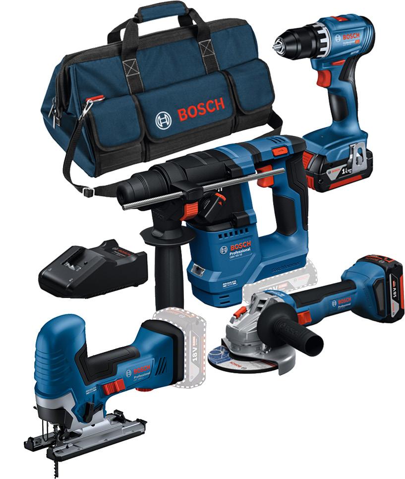 GST SCIE SAUTEUSE, GBH MARTEAU PERFORATEUR, GSR PERCEUSE-VISSEUSE, GWS MEULEUSE D'ANGLE | 2X GBA BATTERIES 4.0 AH, INCL. CHARGEUR RAPIDE ET SACOCHE N° D'ART. 112594 589.–