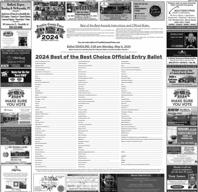 ADID590992 PUBLICNOTICE ESTATEOFSUENELL MITCHELL,DECEASED Case#24-0030 PROBATECOURTOF FRANKLINCOUNTY,ALABAMA LettersTestamentaryofsaiddeceasedhavingbeengrantedto BRENDAMITCHELLLANEand KAYEMITCHELLHALL,asCoPersonalRepresentativesofthe LastWill&Testament,ofSUE C NELLMITCHELL,deceased,on the2nddayofApril,2024,by HonorableBarryMoore,Judge ofProbateCourtofFranklin County,Alabama.Noticeis herebygiventhatallpersons havingclaimsagainstsaidestateareherebyrequiredtopresentthesamewithintime allowedbylaworthesamewill bebarred. 04/10/24,04/17/24,04/24/24 ADID590990 RequesttoVacatetheRightOf-WayOf IndianaStreet KevinRichardsonhascomebeforetheFranklinCountyCommissionrequestingthevacation oftherightofwaydescribedas follows: TheFranklinCountyCommissionproposestovacatetheexistingundevelopedrightofway (varying33feetto66feet) S knownasIndianaStreetdescribedasfollows:AttheintersectionofthecenterlineofHwy 36a/k/aRockwoodRoadand USHWY43headsoutherlyon USHWY43approximately380 feettoapointofbeginning.Beginningatthispoint(intersection ofIndianaStreetandUSHWY 43)inSection13,Township7 South,Range12West(Latitude:34.4543°Longitude:87.7541°);thencewesterly alongthecenterlineofIndiana Streetforadistanceofapproximately445feettothepointof ending,beingtheintersectionof IndianaStreetwith4thAvenue (alsoanundevelopedROW) Section13,Township7South, Range12West(Latitude: 34.4543°Longitude:-87.7555°).