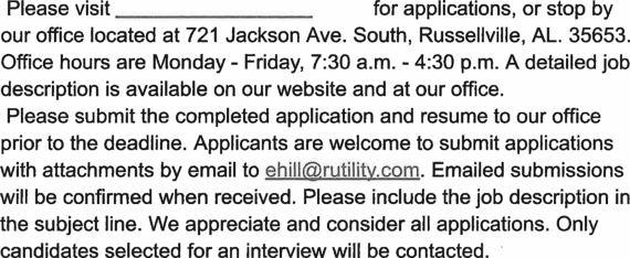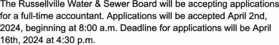 SealedBidswillbereceivedby the RussellvilleWaterand SewerBoard until Friday April26,2024,at10:00A.M., localtime,fortheworkaccordingtoSpecificationsandContractDocumentsonfileinthe officeoftheOwner,theimprovementshereinafterdescribed.Nobidswillbereceived afterthetimesetforthherein above;andtheBidswillbepubliclyopenedandread.TheBid Documentswillbeopenedat RussellvilleWaterandSewer BoardOfficeonFridayApril 26,2024,at10:00A.M.,721 JacksonAvenueSouthRussellville,AL35654.