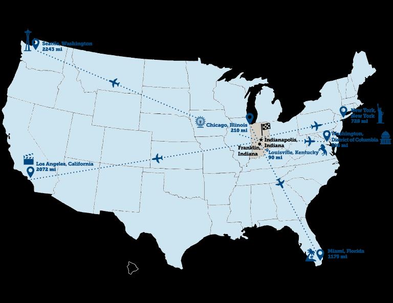 Franklin College is located just 25 minutes south of downtown Indianapolis, in the city of Franklin. We are centrally located to a number of Midwest cities, including Louisville, Kentucky (1.5 hour south), Cincinnati, Ohio (1 hour 45