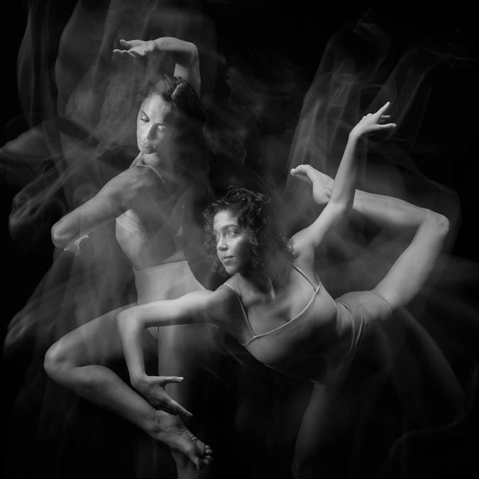 Photo by Pedro Greig featuring dancers from Sydney Dance Company in momenta, Ngaere Jenkins (left) and Tayla Gartner (right)