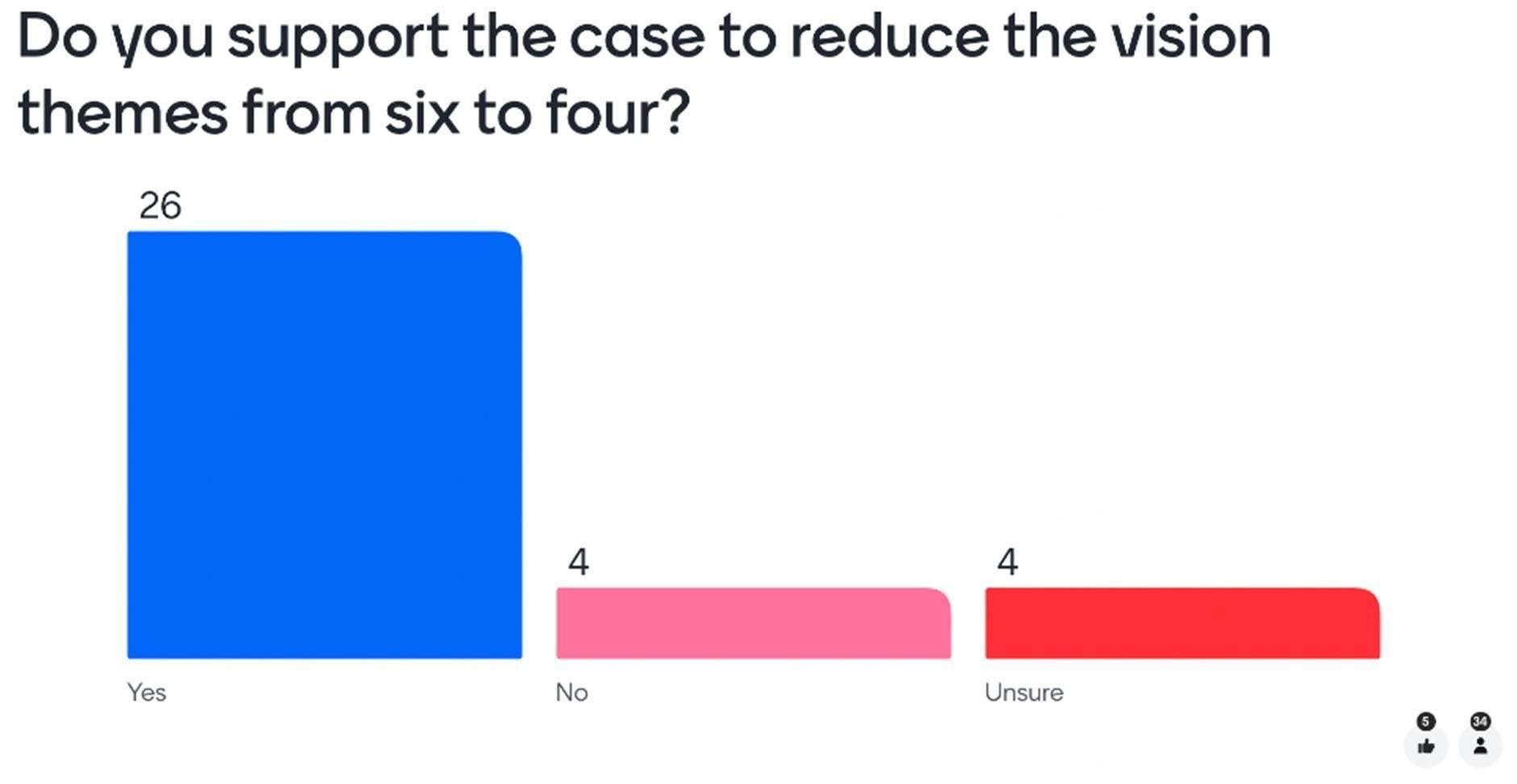 ● Reducing Community Vision themes from six to four: Based on feedback received in broad engagement in Stage 1, Council proposed to the Community Panel a reduction of the existing Community Vision themes from six to four. Council explained the duplication identified by participants in the broad engagement, and Council’s aim to better integrate the Community Vision themes with the Council Plan. There was majority support for this reduction with 26 of the 34 Panel members supporting this move. Refer to Appendix 1.