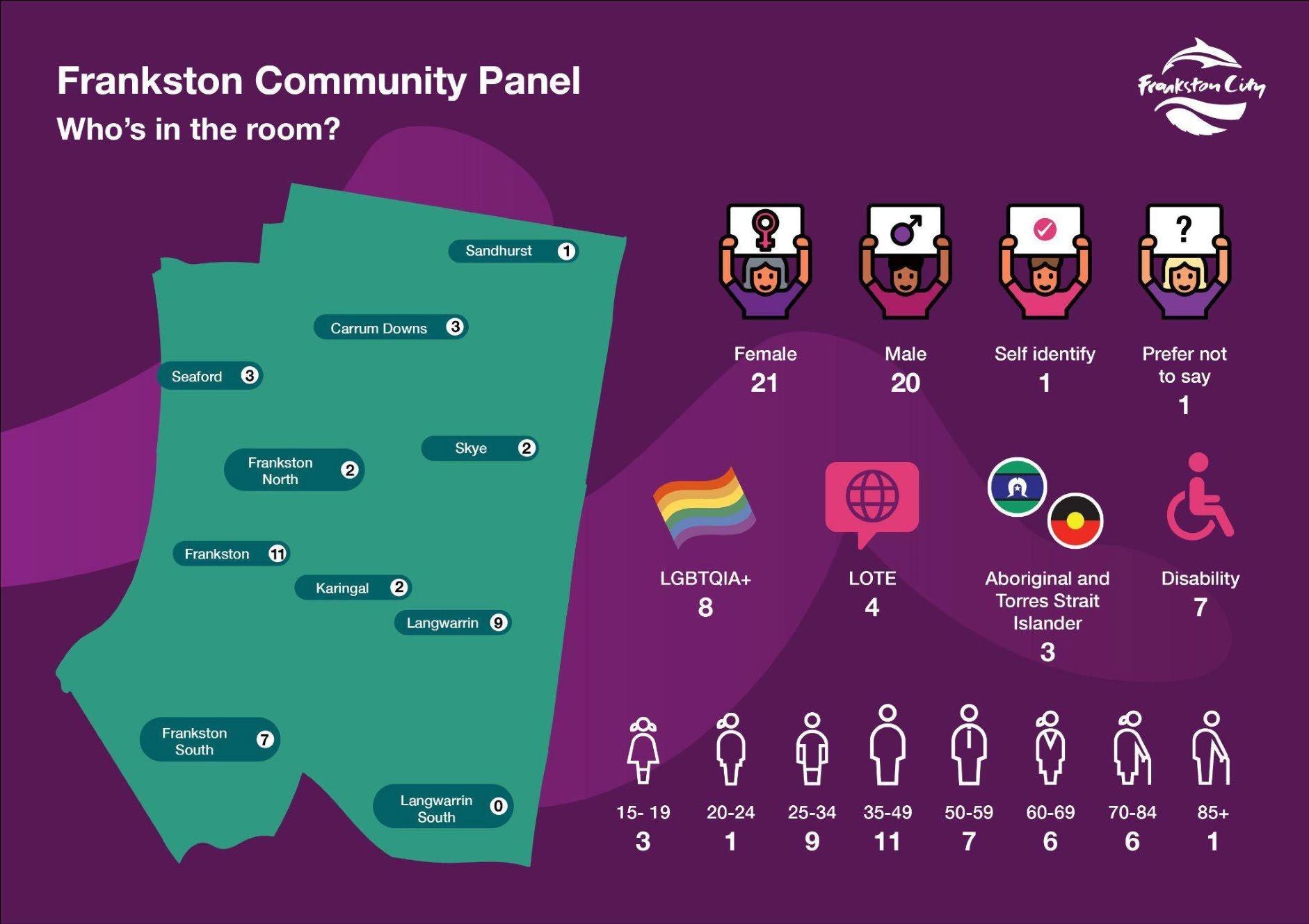 Panel members were recruited by Conversation Co to reflect the demographic makeup of the Frankston City community using a stratified sampling approach. A total of 110 nominations were received, with 44 people recruited, and 39 of these participated in the panel. Figure 1 shows the demographic makeup of the panel across age, gender, house tenure, location, education and identification with demographic descriptors (Aboriginal and Torres Strait Islander, cultural diversity, disability and sexuality).