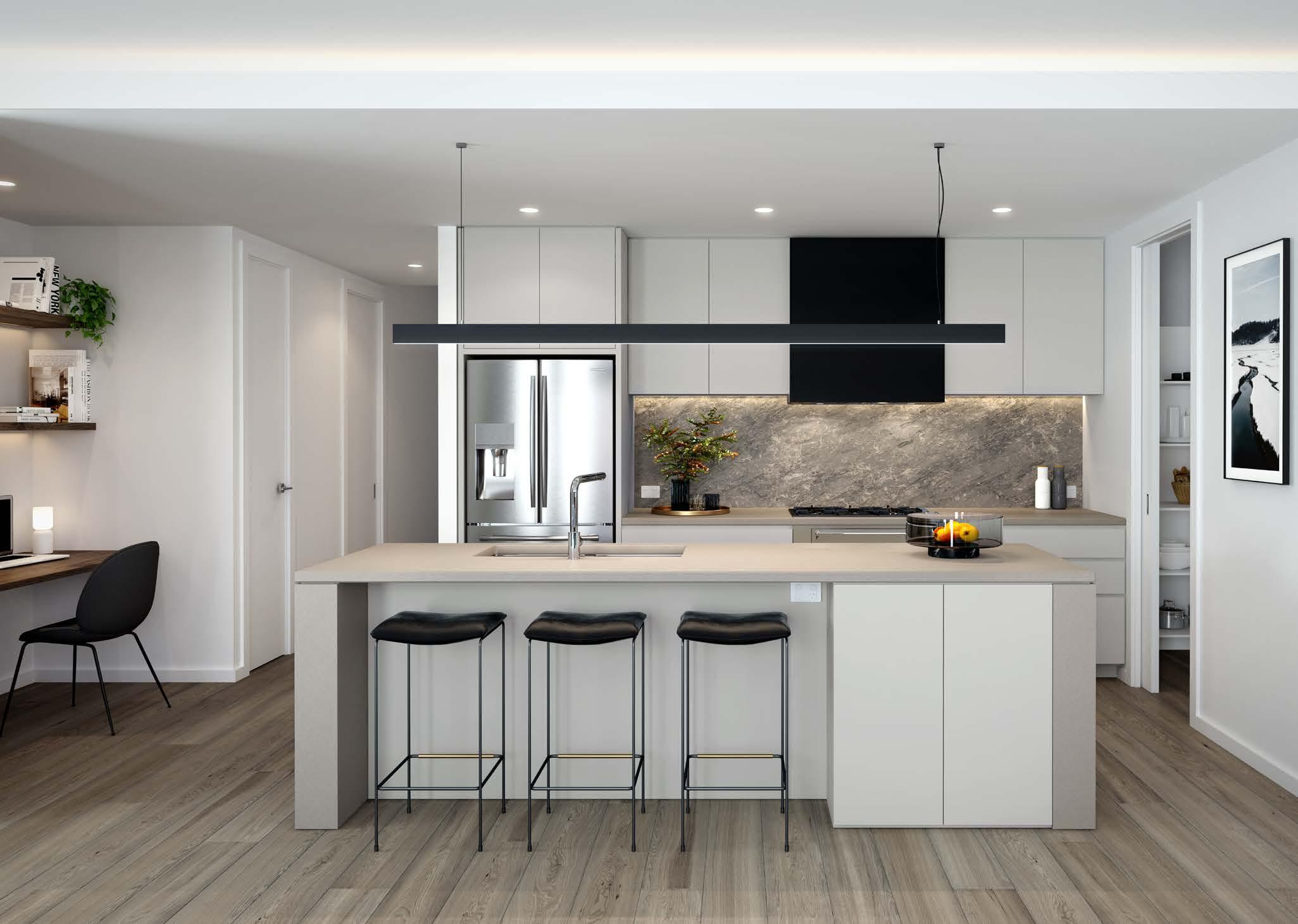 Please note: light scheme will be provided as standard. Purchasers are required to select dark scheme as a nil-value upgrade. Artist impression. Upgrades shown include LED Strip Lighting to lowered ceiling, 40mm Caesarstone benchtop and natural Stone splashback.