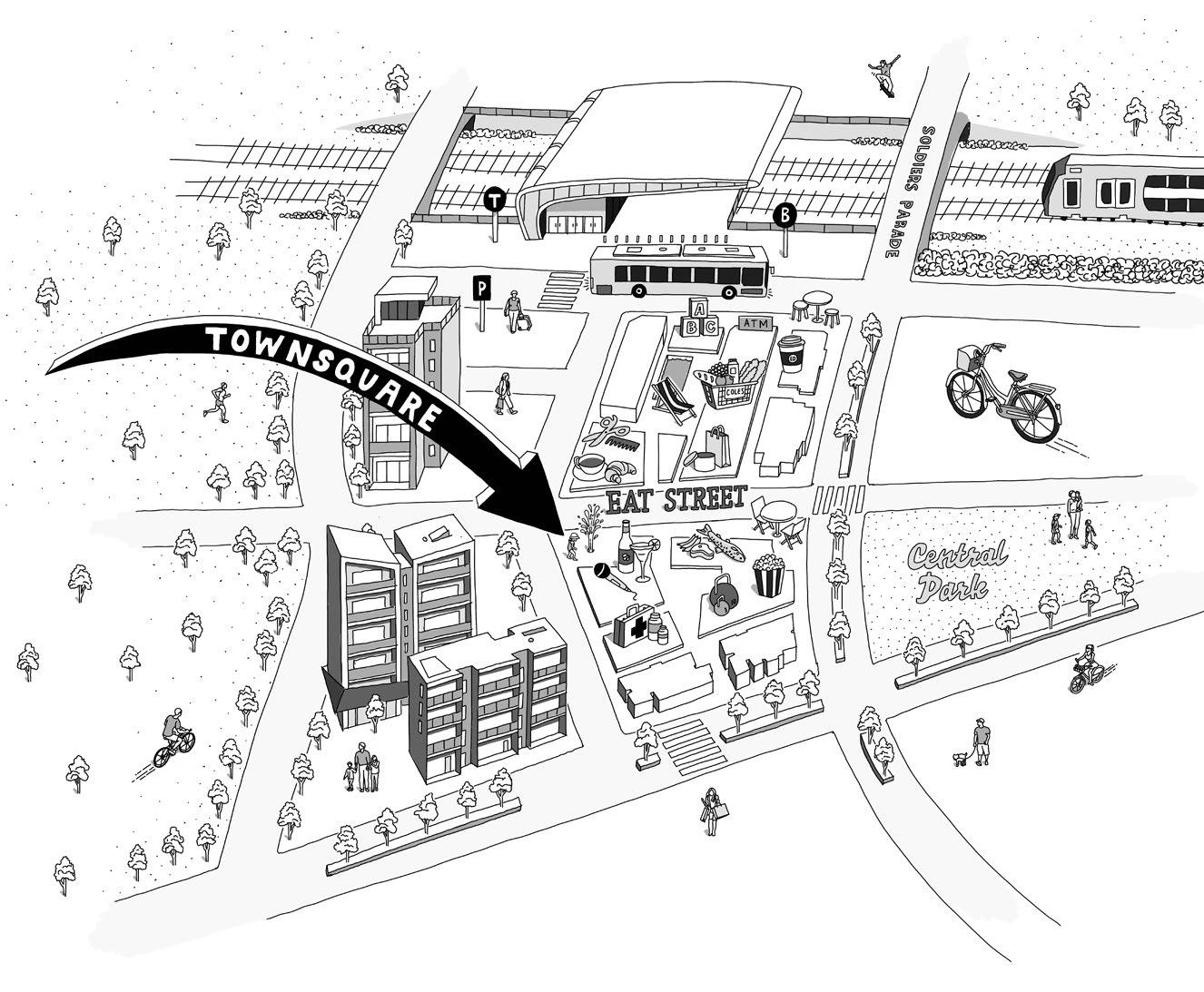 Framed by Eat Street, the Town Square offers plenty of dining options and acts as a meeting point where you can get to know your fellow locals and interact with the people who make this community unique.