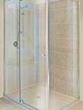 Semi framed shower screens with powder coated aluminium frame (polished silver finish) and clear glazed pivot door.