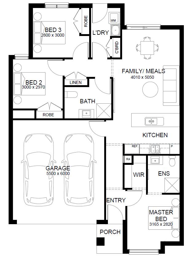Builders range laminated flooring as shown on plan. Selection as per builder’s predetermined colour boards.