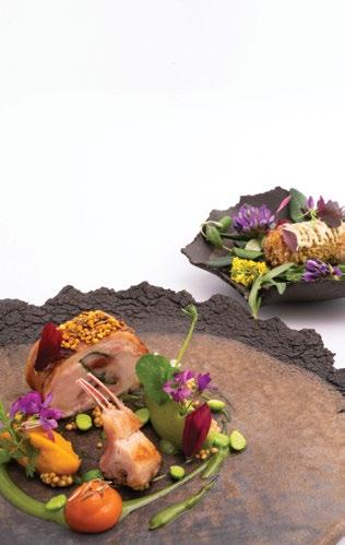 4. Denti de nos côtes, vivifiés d’une émulsion à la fleurs et feuilles de capucines, Fleur d’artichaut accompagnée de son crémeux au malt de cacao