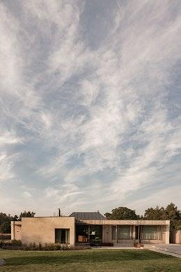 The main building comprises intersecting volumes, thoughtfully arranged to create sheltered spaces that blend effortlessly between indoors and outdoors. The lime-washed brick façade features minimal openings, ensuring privacy, while pine planks line the courtyard walls, enhancing the warmth and intimacy of the pool and terrace areas.