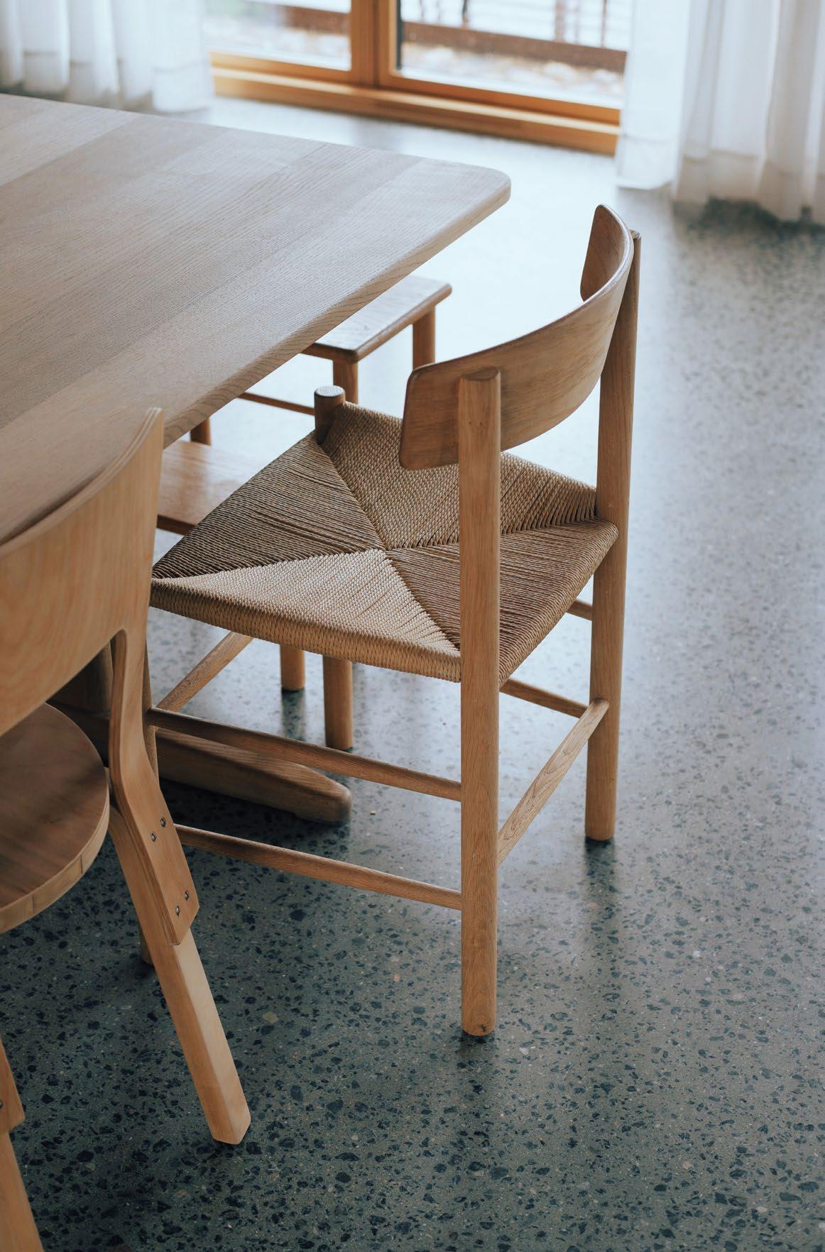 At the heart of the home lies the social core — the living room, kitchen, and dining area. Here, the simple elegance of Børge Mogensen’s J39 Chair and C18 Shaker Table complements the natural material palette, embodying the essence of Scandinavian design throughout the space.
