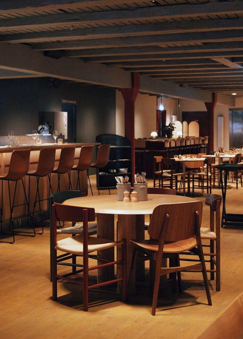 The J39 Chair by Børge Mogensen is a prominent feature throughout the restaurant, adding an elegant touch with its simple, warm, and functional design. These very chairs have a long history in the space – they were initially produced for the previous restaurant, introducing a dimension of sustainability to the decor. As for the rest of the interior, a collection of timeless and sophisticated furniture, including Mogensen’s 2333 Sofa and The Spanish Chair, alongside Keiji Takeuchi’s Seto Stool, contributes to an atmosphere of refined elegance and understated luxury. Stools of varying heights from Maria Bruun’s Pioneer Collection adorn the restaurant, providing excellent seating comfort and flexibility with a sculptural touch.