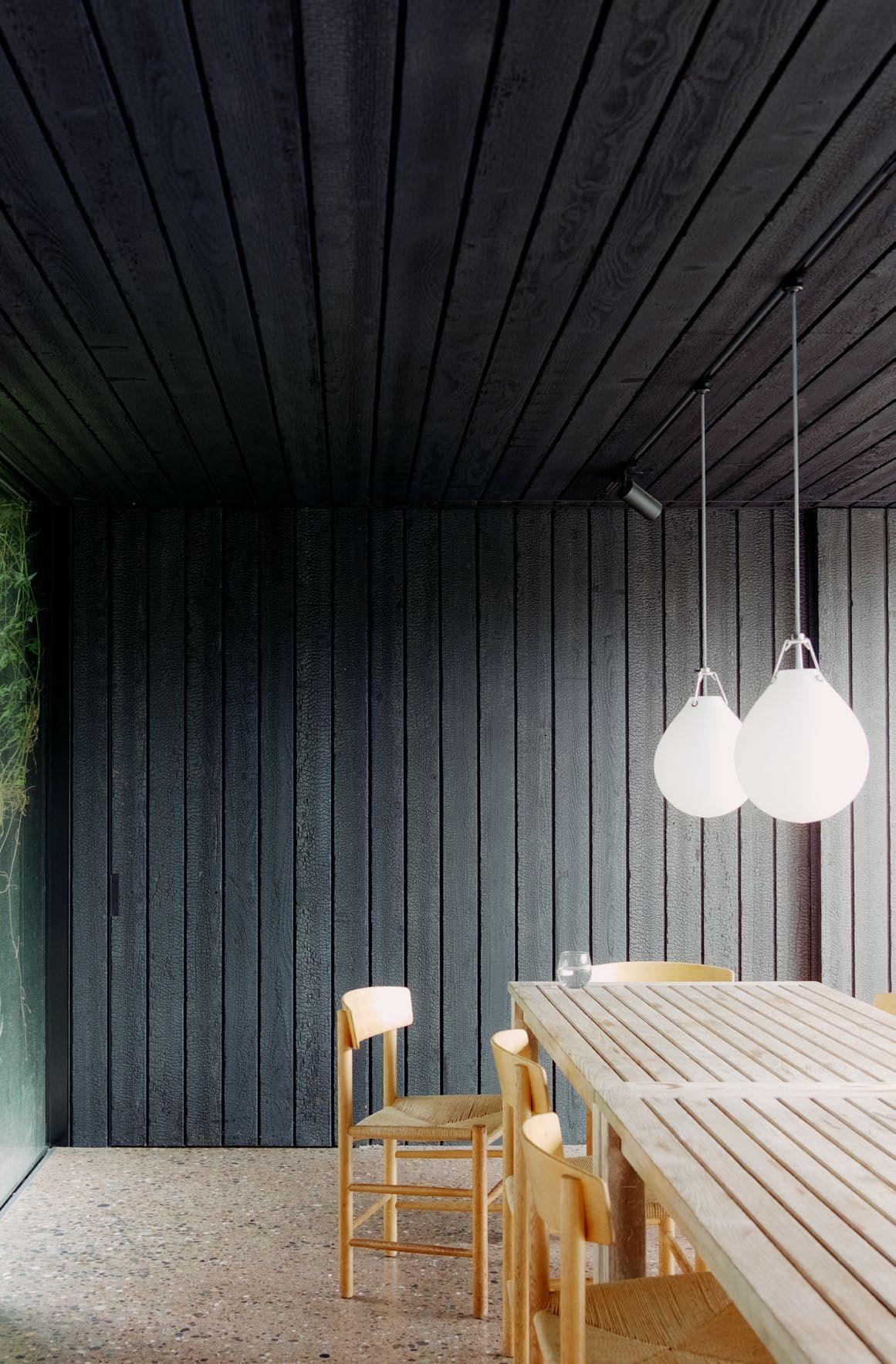 The pavilion is thoughtfully divided into two key areas: a kitchenette and a fireplace, ensuring its functionality year-round. In the summer, sliding windows open the space entirely to the outdoors, allowing for a fluid connection with nature. Around the large dining table, Børge Mogensen’s J39 chairs contrast the charred wood façade and stone floors, adding comfort and understated elegance.