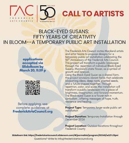 The Frederick Arts Council is seeking artist proposals for “Black-Eyed Susans: Fifty Years of Creativity in Bloom,” a large-scale temporary installation marking FAC’s 50th anniversary. The concept draws inspiration from the famous ceramic poppy installation at the Tower of London: individually crafted Black-Eyed Susans installed across outdoor locations throughout Frederick County and on display through December. Each artist is asked to design a single flower roughly 18 inches tall, suitable for outdoor use, with a plan for producing them in batches. Materials can range from metal and ceramics to fiber and recycled goods. Kinetic and light-responsive elements are welcome. The total project budget is $12,000, and flowers will be sold for around $80 each after the installation concludes. Applications are due March 20 via SlideRoom at frederickartscouncil.slideroom.com. Local artists are especially encouraged to apply.