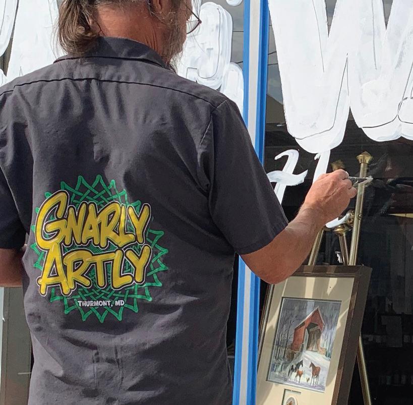 Gnarly is also known around the many counties throughout the DVM for his imaginative window painting for businesses. The town of Thurmont knows both of his professional art abilities