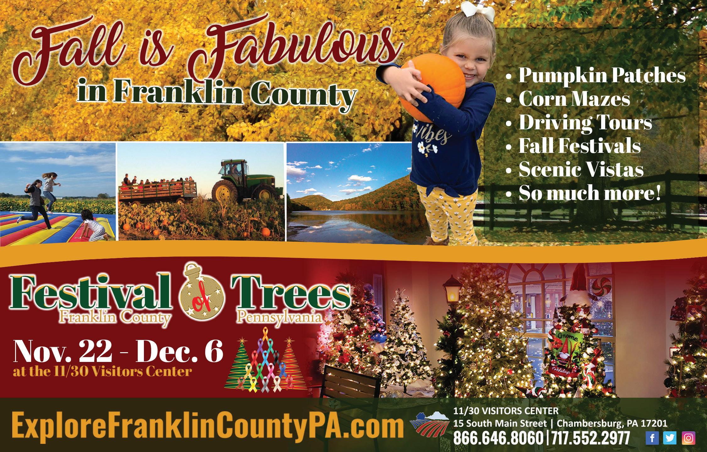 Franklin County, Pennsylvania is a great place to explore history, arts and architecture, recreation, natural beauty, fresh foods, and the warm hospitality of communities like Chambersburg, Greencastle, Mercersburg, Shippensburg, and Waynesboro. Franklin County is located just north of the Mason Dixon Line along I-81. Plan a visit at ExploreFranklinCountyPA.com or call 866.646.8060.