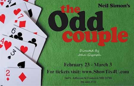 “The Odd Couple” — 8 p.m. at Other Voices Theatre, 224 S. Jefferson St., Frederick. Neil’s Simon’s classic comedy opens as a group of the guys assemble for cards in the apartment of divorced Oscar Madison. Felix seems suicidal, but as the action unfolds, Oscar becomes the one with murder on his mind when the clean freak and the slob ultimately decide to room together with hilarious results as “The Odd Couple” is born. $21.25 to $25. 301-662-3722. showtix4u.com.